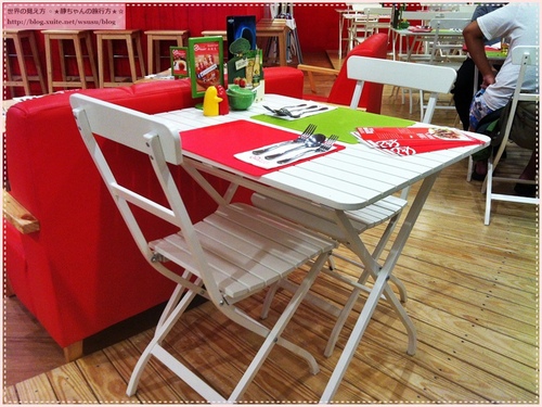 座位分成紅色沙發區和帶有野餐氣氛的白色桌椅區。