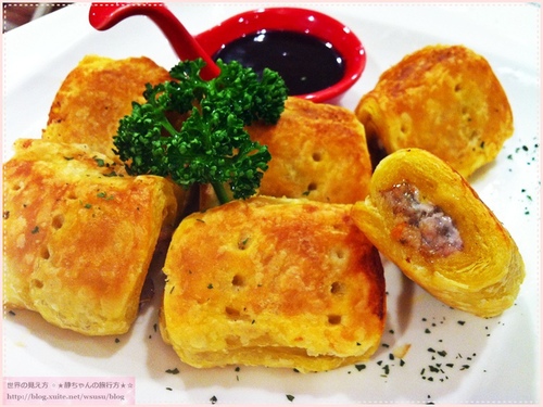 烤的酥香的酥皮,裡面包裹的是有點類似絞肉及漢堡肉的內餡,