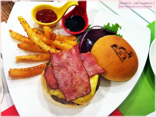 裡面有培根、純手工漢堡排、起士片、新鮮生菜、番茄、紅洋蔥,
