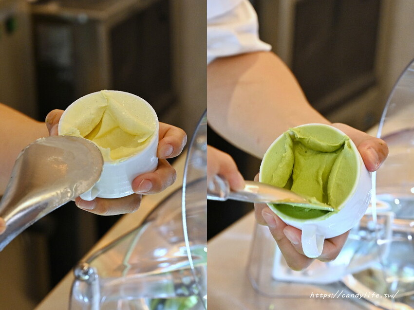 手工義式冰淇淋任選兩球只要100元,糖糖選了芋香南海椰子及優格艾草口味,上頭還會撒上堅果增添香氣,芋香南海椰子吃起來帶有芋頭及椰奶的香氣,尾韻稍微偏甜,另一個優格艾草口味很特別,帶有優格的酸甜
