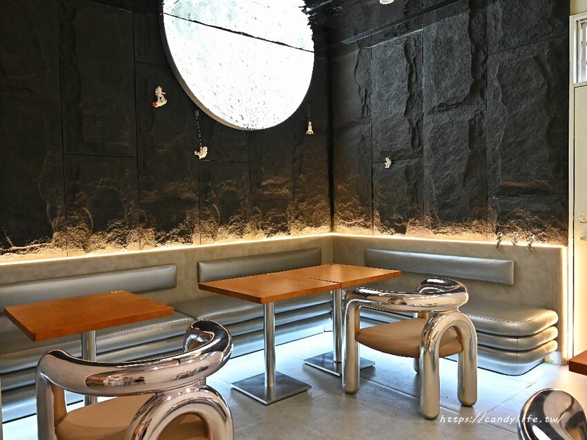 雲朵朵義式冰淇淋不只外觀吸睛,就連店裡頭的裝潢也很特別,目前只有開放一樓的座位區,以外太空為主題,還有個大大的月球造景,可愛的迷你太空人,角落還藏著外星人呢