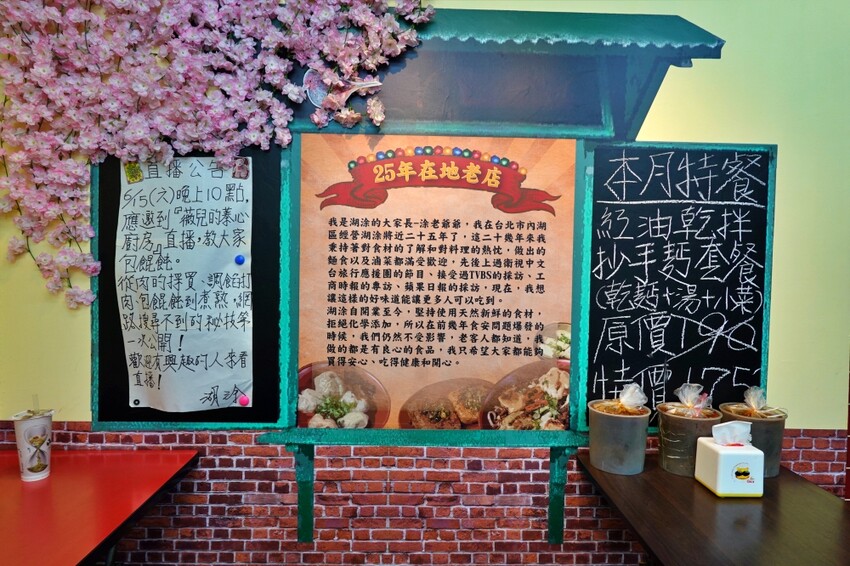 料理區在戶外,內用座位不多,環境很乾淨,牆上介紹麵店歷史以及以前的照片,是已經開業25年以上的老店家了。