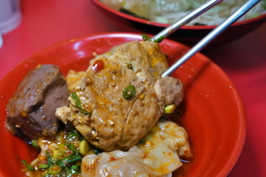 紅油抄手的醬料其實沒有很愛,偏鹹了一點,但是麻辣鴨血臭豆腐的口感味道挺強的,非常入味又軟嫩,搭配再一起很好吃耶!