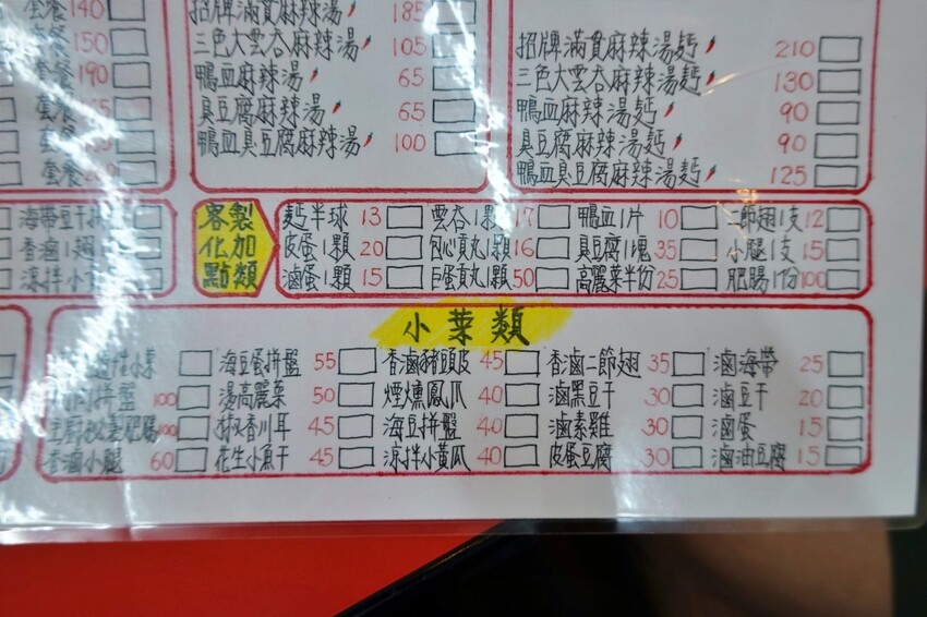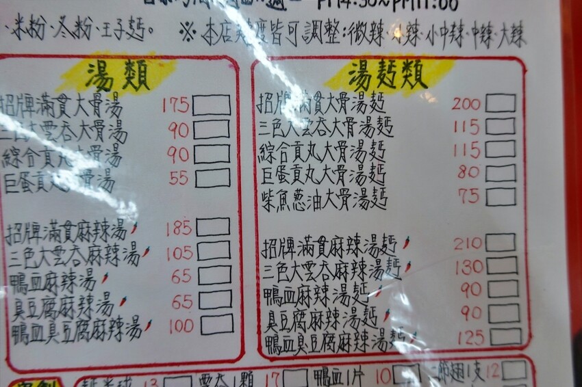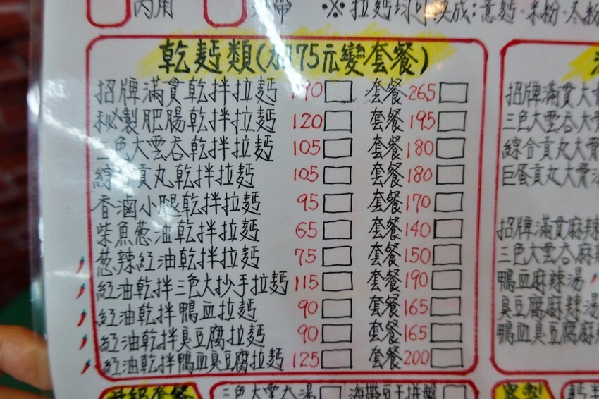 拿到菜單有一度傻眼,因為手寫菜單密密麻麻的,有各種搭配選項,太久沒來花了一些時間看菜單,乾麵、湯麵選擇非常多樣化,還可以客制化,真的眼花撩亂了!!