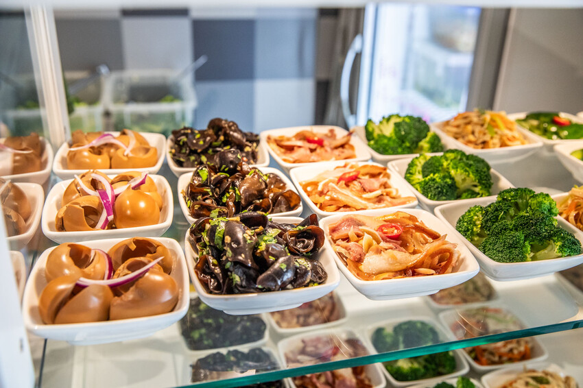 小菜櫃,整齊排放看起來就是好吃樣,不少人來點一碗麵搭配兩到三種小菜,小菜都是店家自己做的唷,雞湯麵都是現點現煮,可以先拿些小菜邊吃邊等