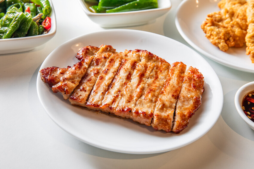 現煎醃豬排,豬排經過獨家特製醬料醃製後,採用小火慢煎的方式精心烹調,不添加任何外層粉衣,賦予了豬排一種濃郁的古早味,使其既柔軟又富含肉汁