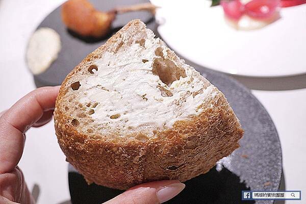 接著是主廚手作的手工歐包,帶有酸種的風味,麵包外層香酥,裡面的麵包體是有彈性軟硬適中,抹上一些鹹味的奶油吃,滿足了麵包控的我^^