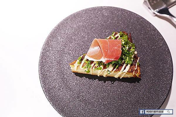 這是一道馬鈴薯起司餅,用馬鈴薯為基底做成一塊餅,上頭用美乃滋、鮪魚和Tabasco做成的醬汁,帶來滑順口感,最上層再放上一片帕馬火腿帶來鹹香滋味,和鬆軟的馬鈴薯搭配吃起來,口味上偏重,讓我們快速打開味蕾。