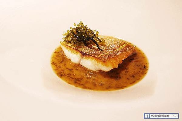 四面環海的台灣最不缺的便是海鮮了,主廚也針對當地的食材充份運用,把這道金線蓮的魚料理,表皮香煎出酥脆口感,加上魚肉本身較細緻,再搭配主廚用昆布及柴魚和奶油去熬煮出香濃入味的醬汁,最上面再用海葡萄做裝飾,是鮮味十足的一道魚料理。
