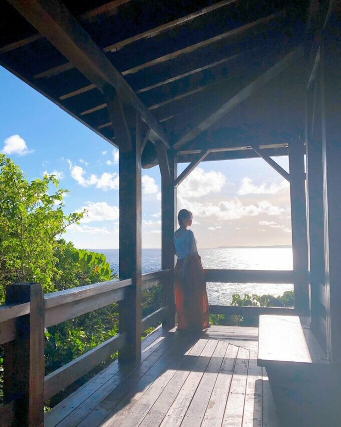 爬上階梯,來到海濱的最高點「滄海亭」,是一座賞海涼亭,往北方望去最左端的陸地是貓鼻頭,與湛藍的海岸交互銜接,可以看到整個恆春的海岸線,在園區內與太陽的親密接觸後,很適合在這裡避暑,這裡也是一個拍攝夕陽日落的好地方,看著餘暉慢慢沒入海中,吹著徐徐吹來的海風,彷彿時間就停止在這裡。