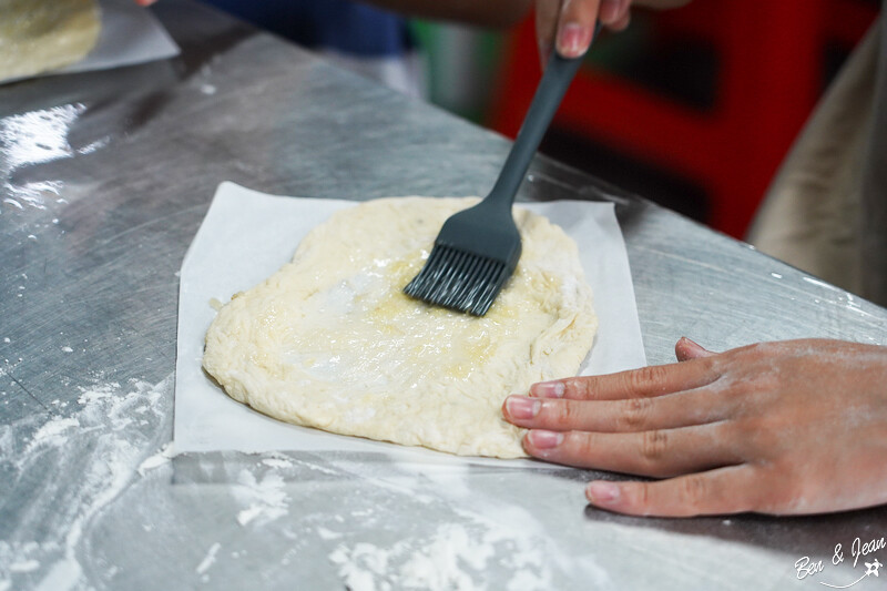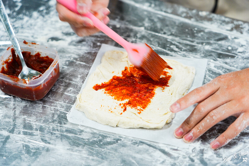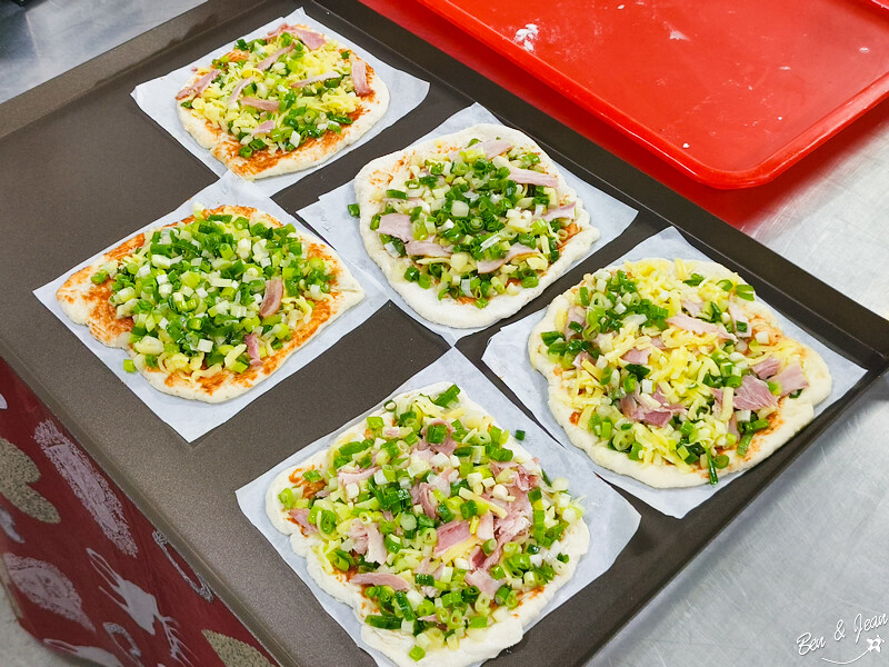 其實做法和剛剛的蔥麵包差不多,只不過薄皮披薩的皮要更平更薄一些