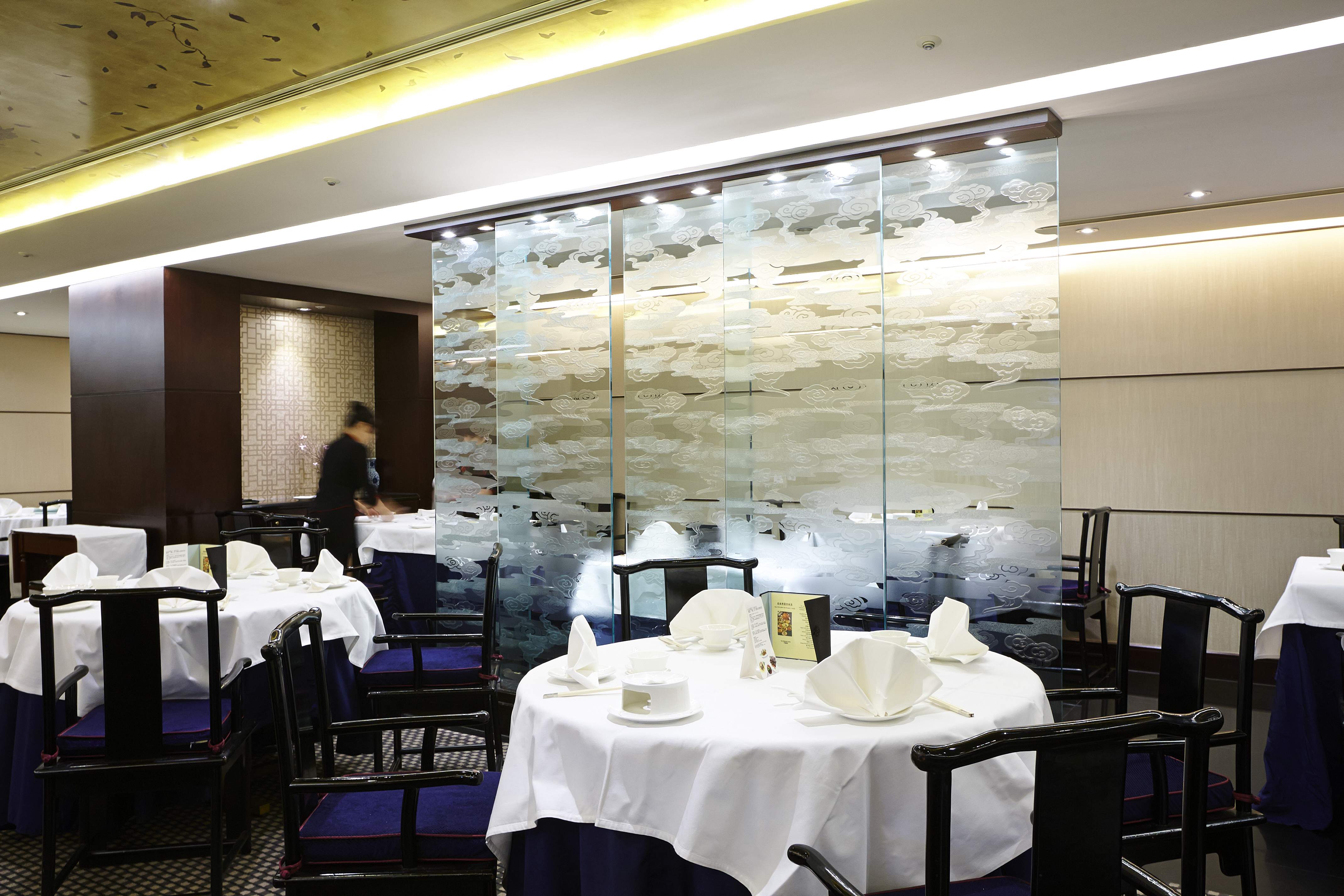 進入餐廳映入眼簾的是經由香港設計事務所Hirsch Bedner 規劃設計的雲彩透明玻璃,黑色大理石地板與金箔的天頂設計。