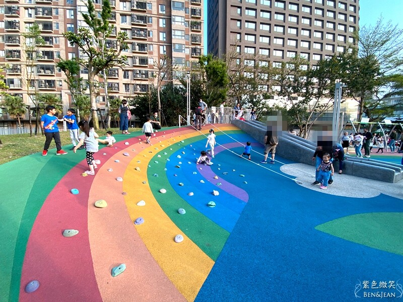這一大片的彩虹攀岩磨石子溜滑梯結合了彩色攀岩塊、攀岩繩、磨石子滑梯,坡度也不大,算是裏面最溫和的活動了,小小孩很適合哦