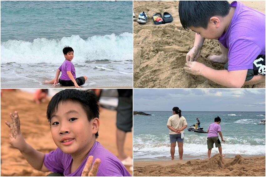 孩子玩沙、大人踩踏海浪拍美照