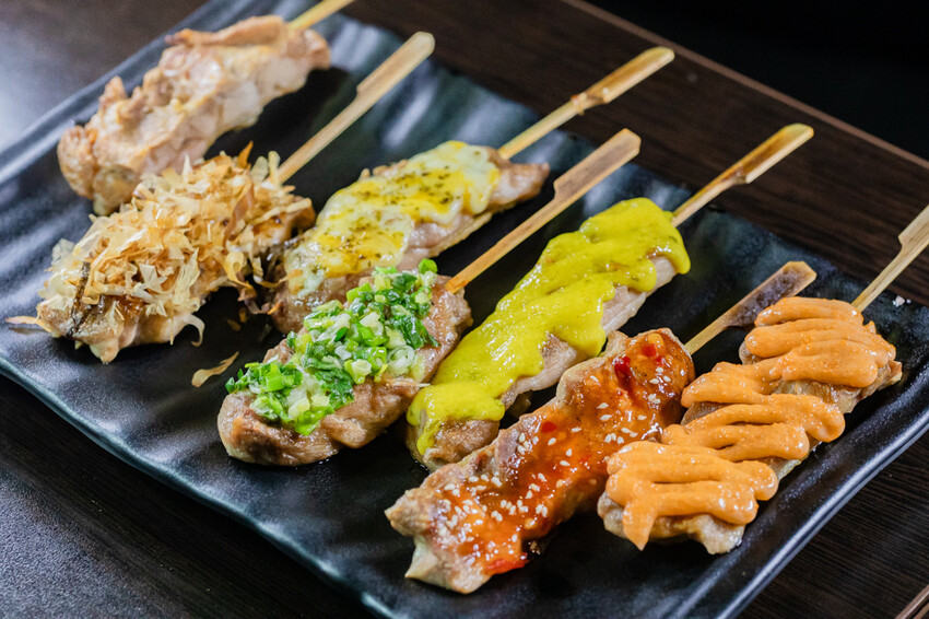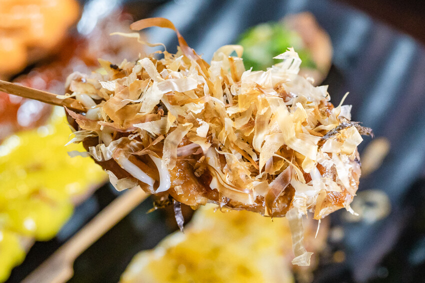 ▲這道雞肉串上有大阪燒風味的醬汁和配料,口感豐富,味道獨特。