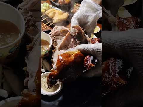 烤雞色澤金黃,帶有迷人的香氣,還附送洋蔥、雞油跟胡椒粉,套上手套跟塑膠袋,將烤雞逐一拆解,露出雪白雞肉跟滿滿肉汁,看起來好誘人啊。