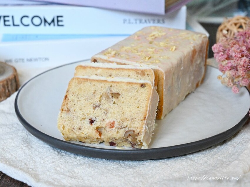 這款穀香貝瑞磅蛋糕很適合平常不太吃甜食的長輩們,採用麵粉及全麥麵粉黃金比例製作,裡頭加入了核桃及蔓越莓,淋上白巧克力淋面來取代較甜膩的糖霜,接著撒上櫻花粉及茉莉花瓣
