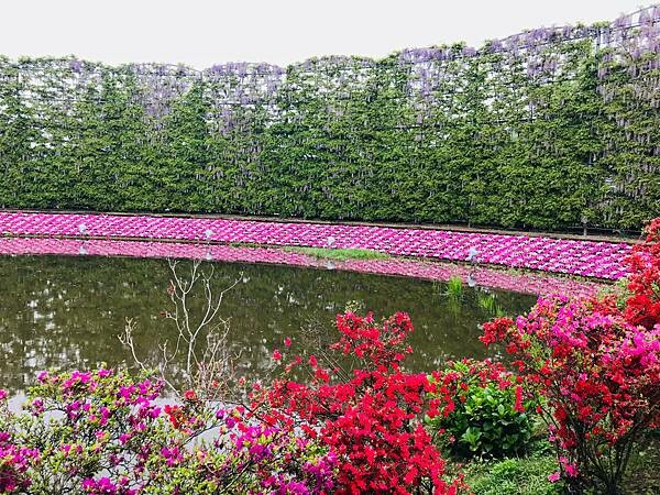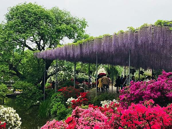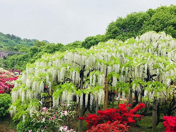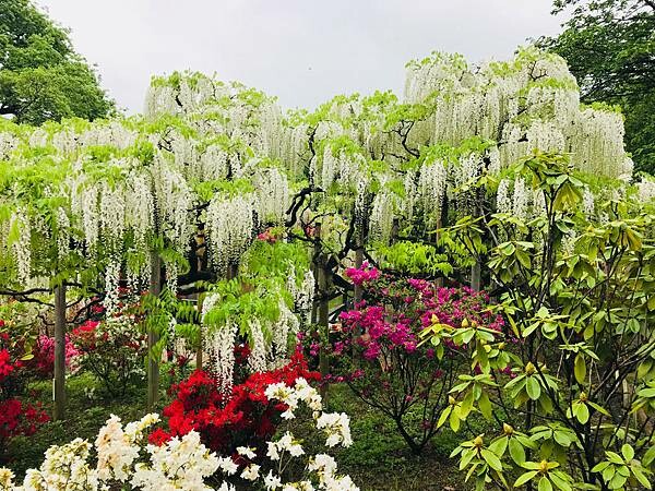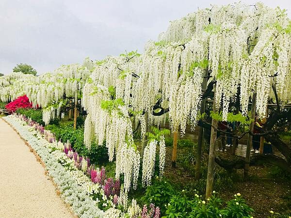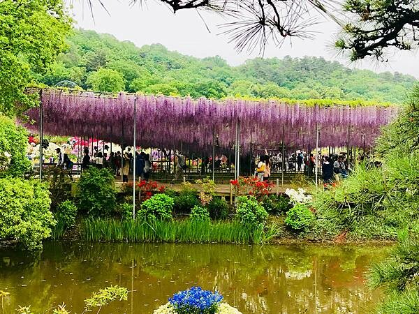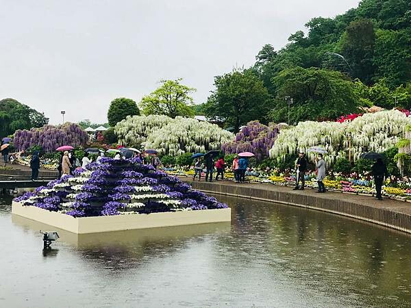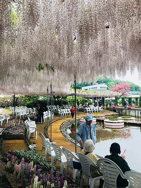 人超多又下雨可日本人就是好有禮貌不會推擠,拍照也有不會在你面前突然要按下相機時走過你前面,園裡有好多椅子在棚架下讓走累的人可以歇一歇,也有販賣食物便當飲料的商店,還有好多的お土産商店賣好多和紫藤有關系的東西,超好逛好買就是人太多了☺️
