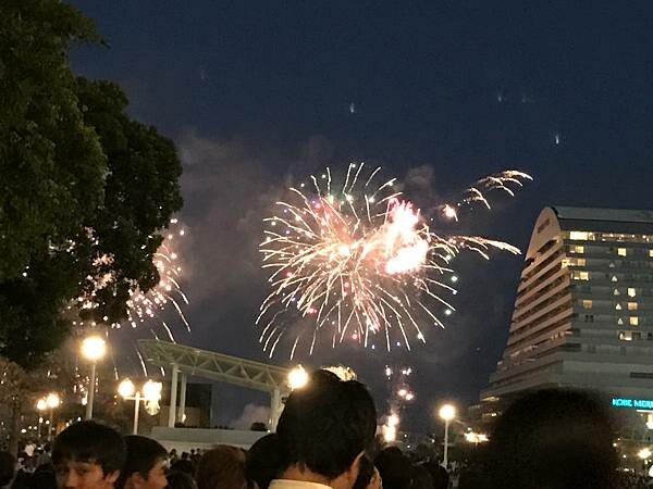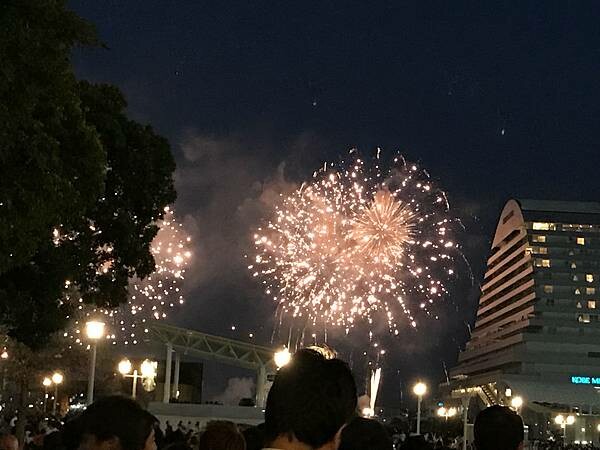 我找好位置靜思坐下,靜待晚上7.30的到來,哇!人越來越多了!晚間7.30準時,看著第一個煙火的看始,歷時一小時多無間斷的發射約1萬發的煙火以神戶美麗的夜景為背景,將神戶的夜空添上美美璀璨非常絢丽的色彩。