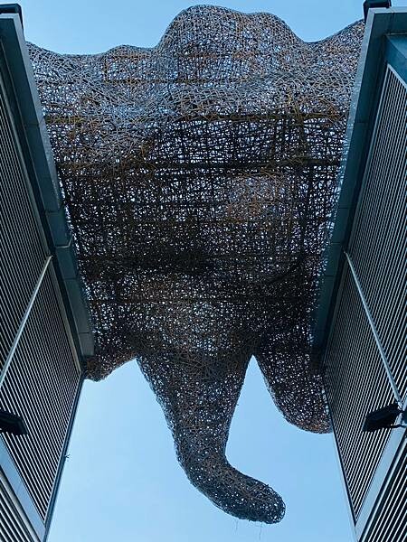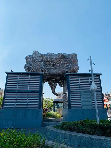 1)記憶的重量漂浮之塔:藝術家是曾瑋。他將海安路被拆除的五金舊材料比如鐵件、電線、燈具等等重新轉至到現場。大球體是由電線捲成直徑270公分再安裝在兩座通風塔之間,讓人可以把這回憶都記錄在這裡。