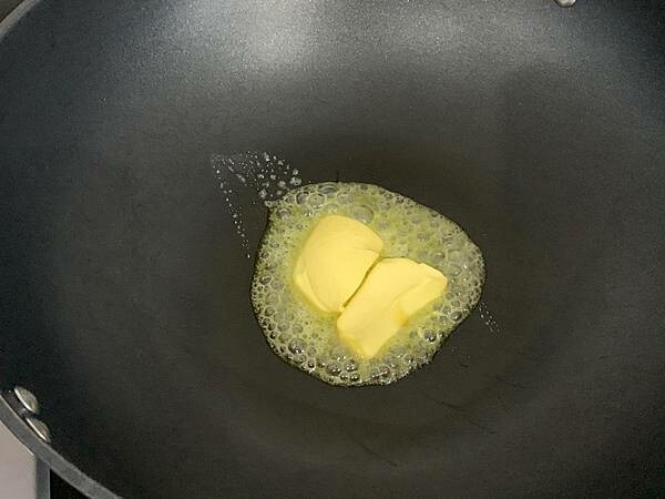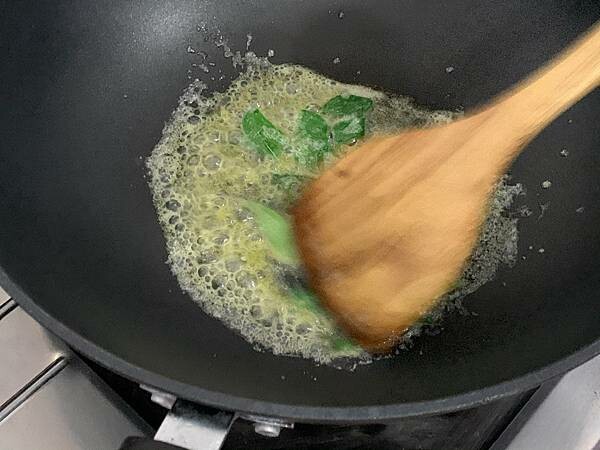 6。用另一個鍋,放入牛油,當牛油融化時,放入咖哩葉,拌炒一下