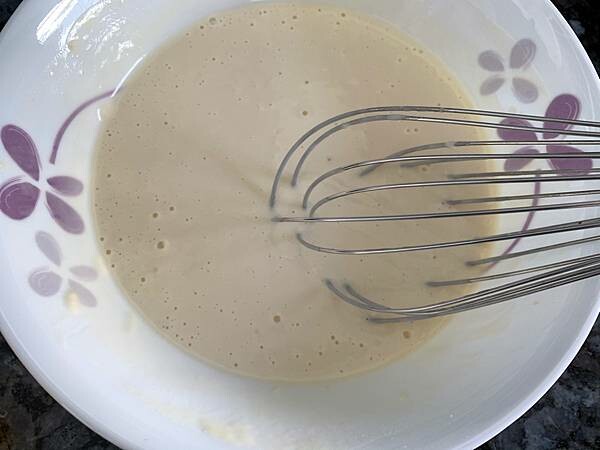 3。備熱油鍋時,把麵粉用清水調配拌均勻,麵粉和水可以視麵糊濃稠度而加減