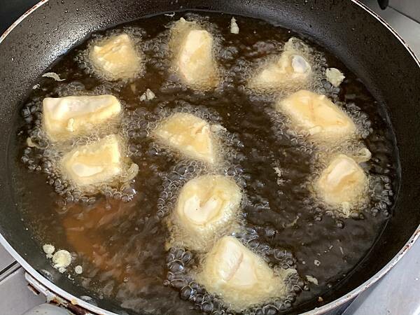 4。杏鮑菇放入調好的麵糊中裹上麵糊,下鍋油炸