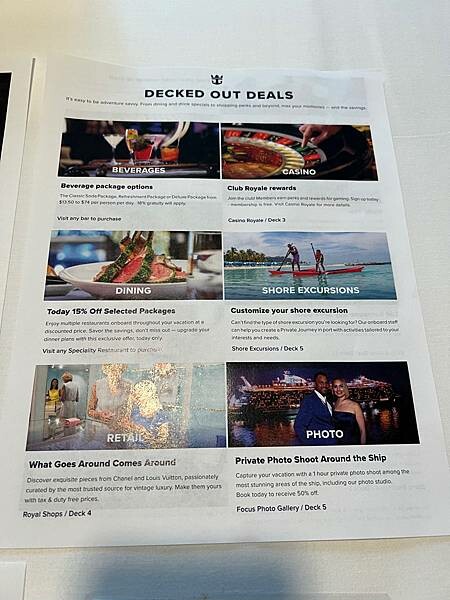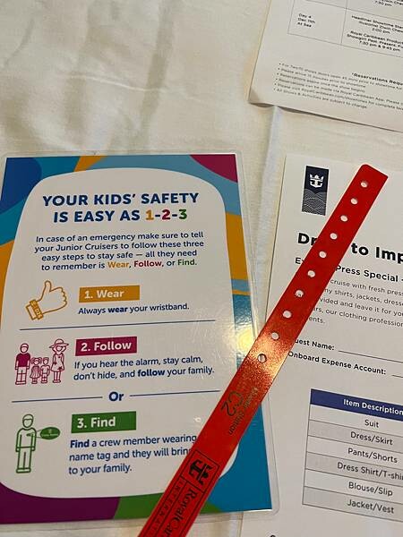 在床上有放了幾張紙關於觀賞表演節目的時間表、餐廳、岸上遊覽的選項。。。等等資訊供參考,如果有小朋友的家庭,也有提供名字手環,這是預防小孩跟家人失散時可以即時處理跟找到