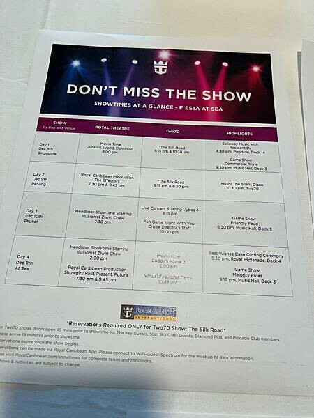 基本上,所有的餐飲、娛樂、活動設施,都可以在check in完畢,登上郵輪再連結郵輪的WIFI後,才可以通過皇家加勒比海郵輪的app做預約(注:所有預約都是在登船後才可以開始進行預約)。建議在搭乘郵輪前,可以跟旅伴商量好甚麼餐廳、娛樂、活動是要體驗的,這樣一來一連上WI-FI就可以馬上在app裡直接預約。比如Silk Road,公主就是慢了動作,預約滿了,沒辦法看到。