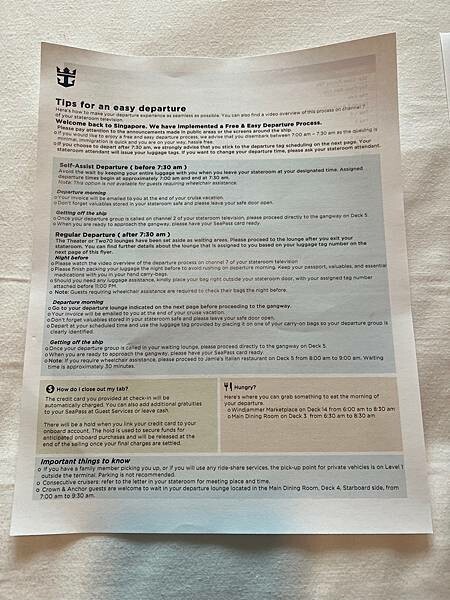 簡易離開郵輪通告,上面會有註明離開郵輪的推薦時間會依據標籤號碼,以避免過於人潮擁擠的情況發生。通告中也會說明離開前的早餐時間跟離開的方式