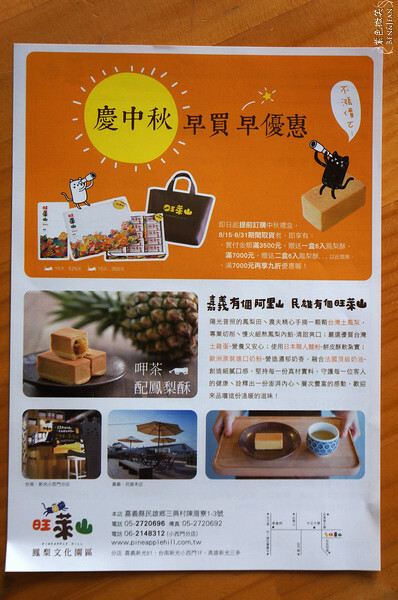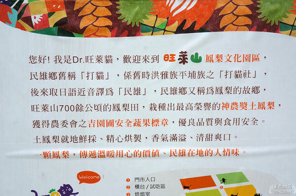 鮮少人知道嘉義民雄景點》「旺萊山鳳梨文化園區」是旺萊山免門票觀光工廠,這座鳳梨園有酒與醋生產設備導覽行程,並提供鳳梨酥及茶水試吃。有趣又好玩,LOGO特別有趣呢,可是全國最大的鳳梨酥生產區!