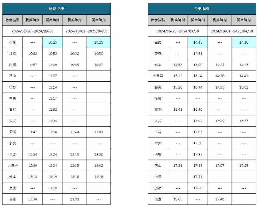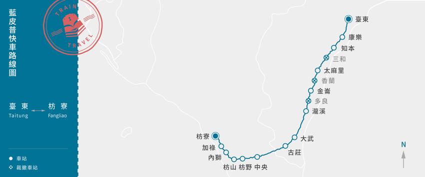 新的藍皮解憂號列車行駛趟次每天兩趟,火車將以緩慢的速度從枋寮開往台東全長8.248公里,車程約兩小時,途經17座車站,橫跨了大、小橋樑近二百座,一路領略南迴線上每一片風景。這條藍皮觀光鐵道路線不僅是全台橋樑、山洞最多的南迴鐵道,沿線可同時欣賞台灣海峽與太平洋海景,也被譽為全台最美的鐵道路段,串連了擁有最美車站美名的「多良站」、台灣最南車站「枋山站」、最大小站「加祿站」、無人值守秘境「枋野站」,此外其他停靠站點還包含內獅站、大武站、古莊站、瀧溪站、金崙站、太麻里站、知本站、康樂站、台東車站等。