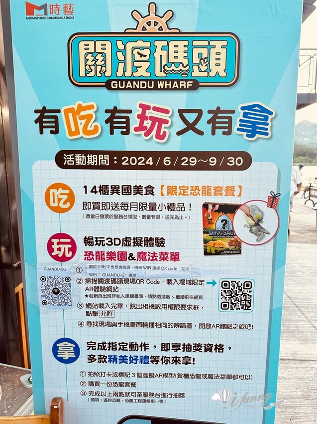 這天暑假小旅行,帶了閨蜜的兩個小男孩,夜宿北投水美溫泉會館,搭配夏日魔幻旅程>專案,除了提供去程的交通,並供應關渡碼頭貨櫃市集的消費券,於是就安排來此看夕陽並吃晚餐。另外也可以搭乘捷運到關渡站,然後轉搭台北市公車紅35、小23至關渡碼頭站下。附近的停車場腹地很大,很適合全家人開車來逛逛。