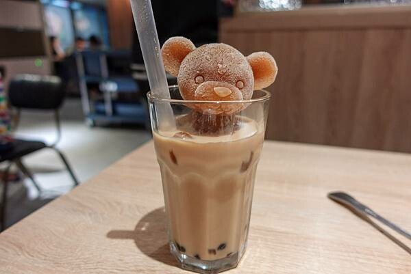 另外單點了一個熊熊奶茶加珍珠,一隻熊熊泡在奶茶裏相當可愛,我偷咬了一口是紅茶冰磚的感覺,這個設計很聰明,不但可愛又可保冰,同時若融化也不會讓飲品變淡!