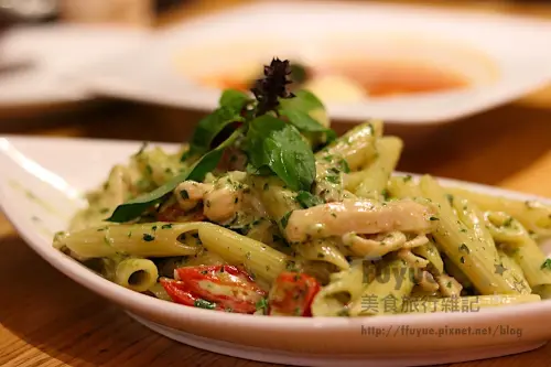公主點了墨西哥烤雞腿肉寬義大利麵,以及加點台幣179 元湯品跟麵包