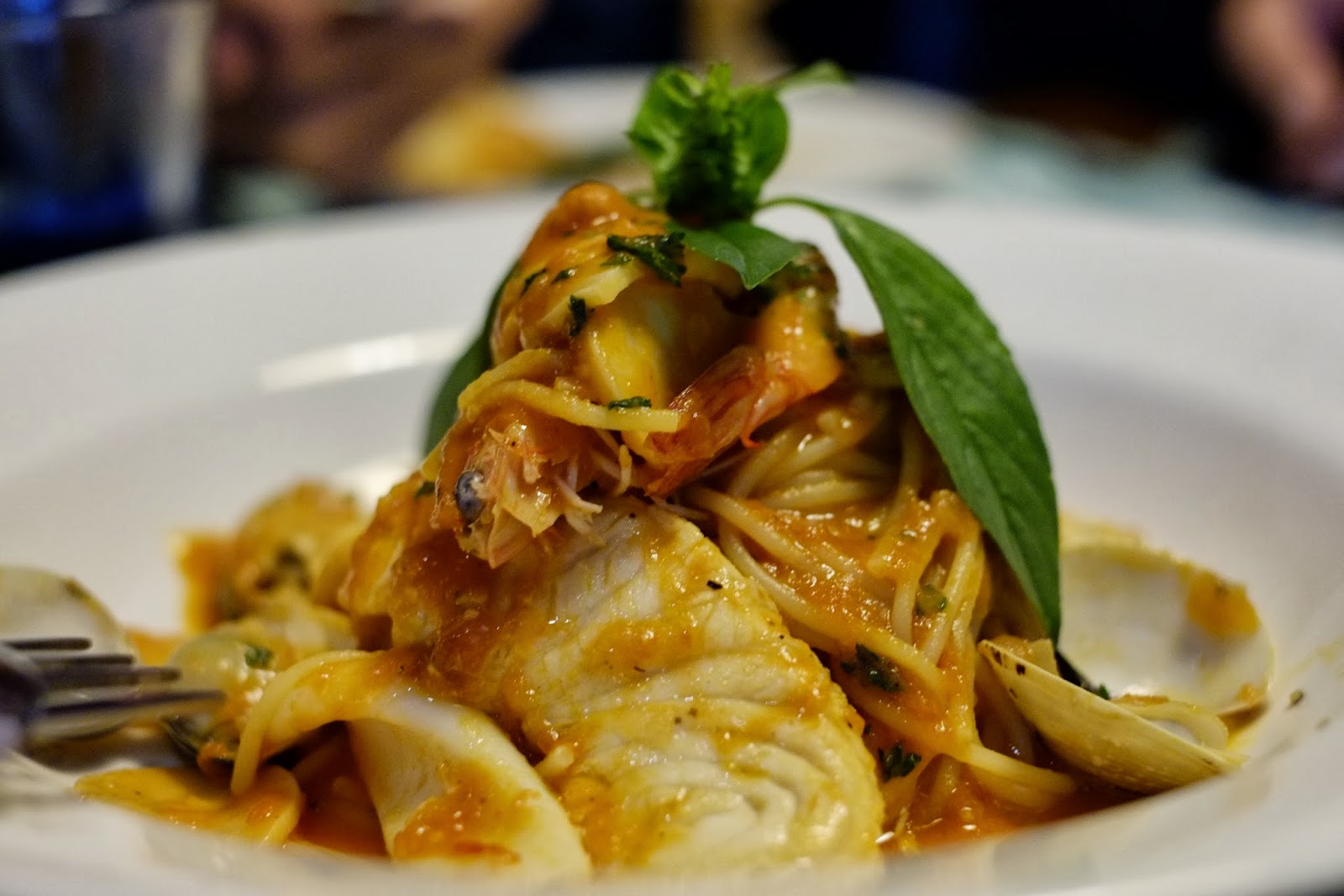 海島風情茄汁義大利麵,有蛤蠣、魚肉、透抽、加上滿滿的蕃茄醬汁,最上面擺羅勒葉,這道擺得很漂亮,但是我沒吃,其他人口感說不錯,但跟披薩比起來,批薩大勝無誤。