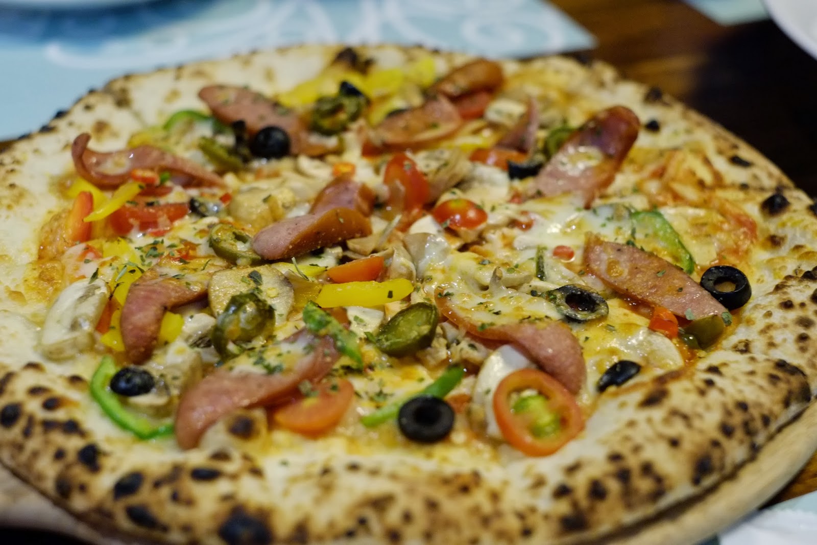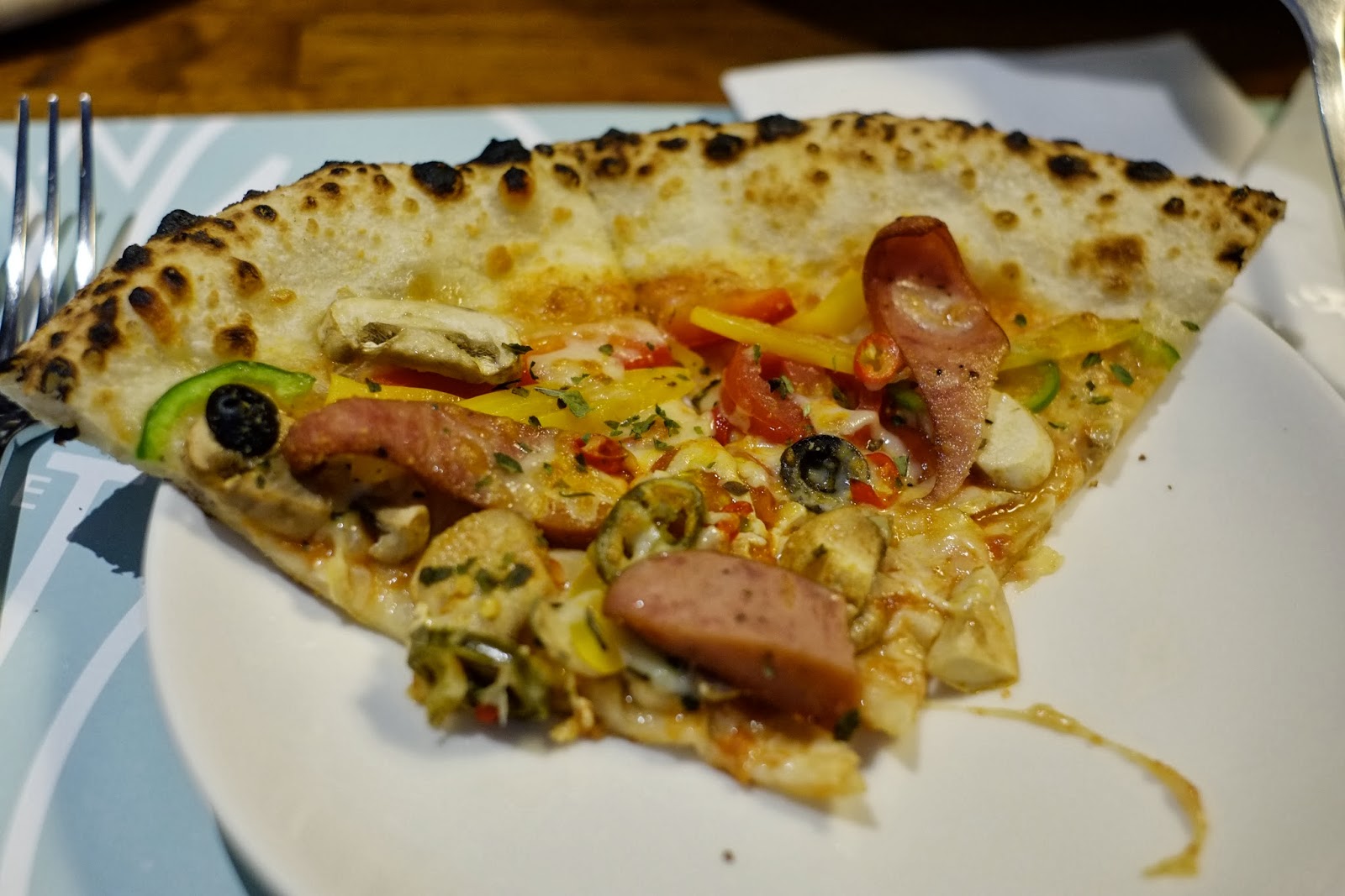 墨西哥嗆辣披薩,繽紛五彩,彩椒、黑橄欖、墨西哥辣椒、德國香腸等等配料,這個有偷偷吃一下,口感很豐富,餅皮美味好吃,墨西哥辣椒跟小辣椒會辣,但不會辣到吃不下去,其他人一直哀號,不過蕃茄醬還是…但是餅皮口感真讓人喜歡