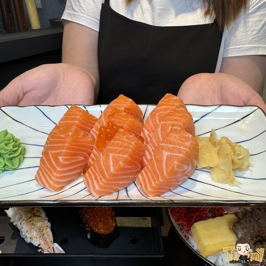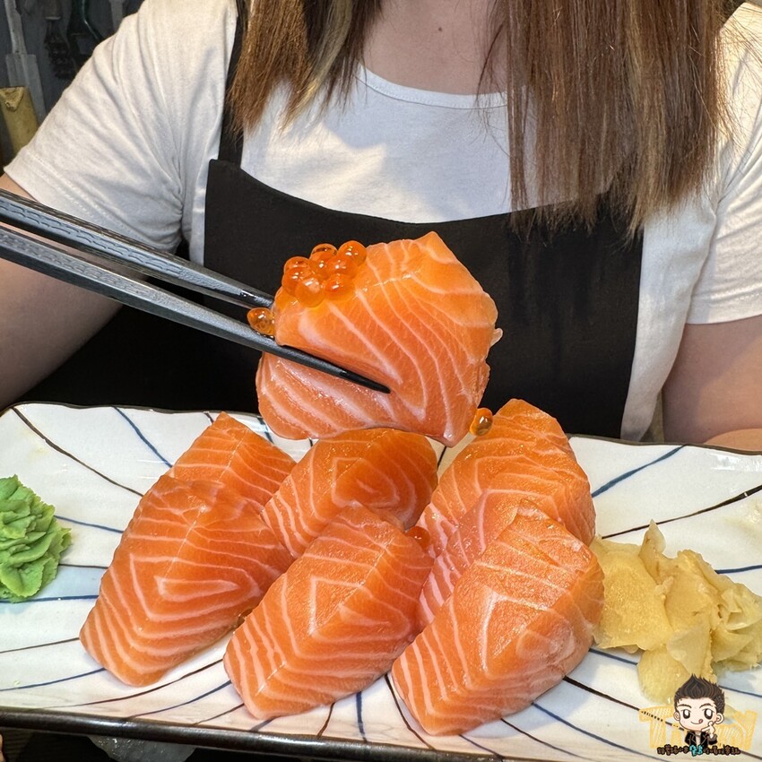 鮭魚生魚片(368元)光看色澤就知道很新鮮,上層還有鮭魚卵,真的是鮭魚一家親 XD