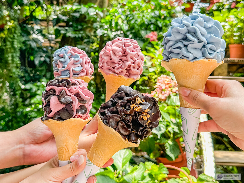 繡球花霜淇淋總共有5種口味,蘭姆可可、濃情玫瑰、天空優格,以及兩種混搭,一支$200,門票可以折抵,等於一支$100,到手真的要趕緊拍照,因為天熱融化超級快~
