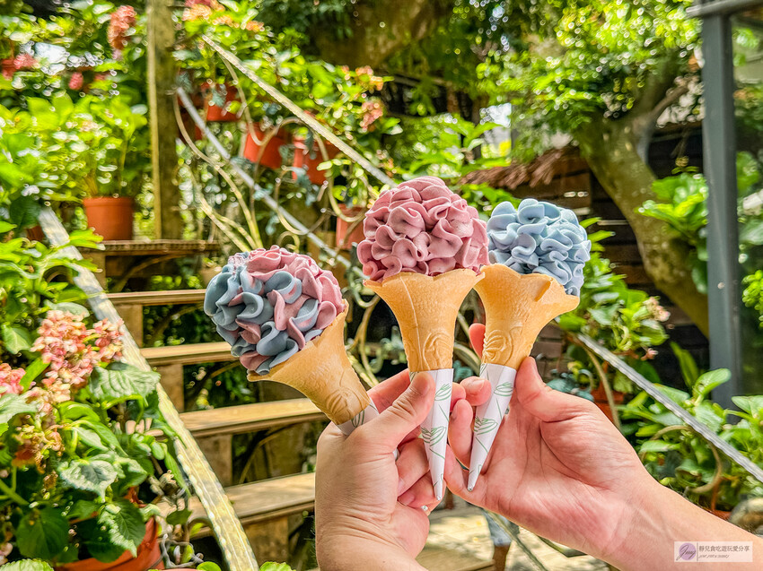 沒想到繡球花霜淇淋這麼美又好拍,隱藏在花露農場裡的夢幻霜淇淋,有三種口味,既繽紛又消暑,即使已經過了繡球花的季節,區內依然布滿了各種花卉,如火鶴、蘭花、香草和波波草等,依舊綻放著,還可以搭小花車欣賞園區花卉美景,也有不少超好拍的造景可以拍照留念~