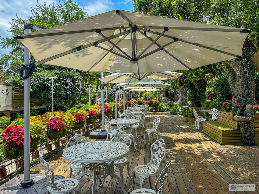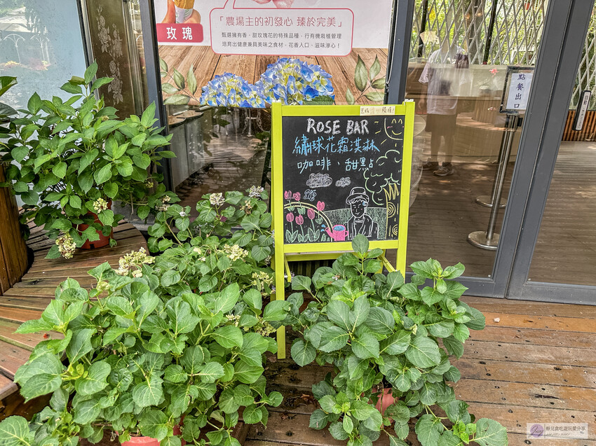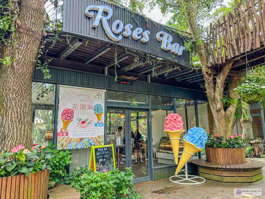 玫瑰吧就在我們入園後沒多久就可看到,門口兩個超大的繡球花冰淇淋模型,相當顯眼吸睛,也有很多戶外座位區,天氣涼爽坐在這吃冰也挺不錯的~