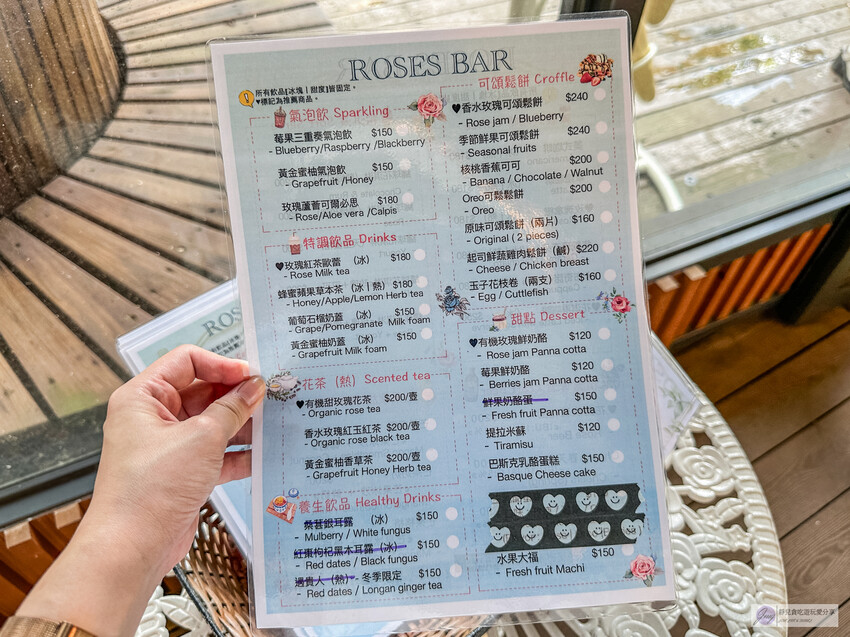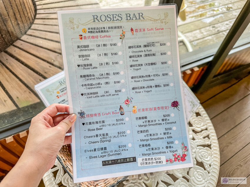 菜單有咖啡、飲品、霜淇淋、冰沙、 鬆餅、花茶、甜點等,價位落在$120~$250之間,門票可以折抵$100~