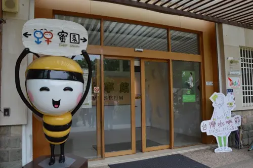 「蜂采館」的主體建築十足吸睛,從外觀看來就好像是歐式鄉村風格的民宿,淡黃色為底色的外牆,讓遊客還沒進入園區,心情就十分愉悅。入口處兩個可愛立牌正迎接遊客的到來。
