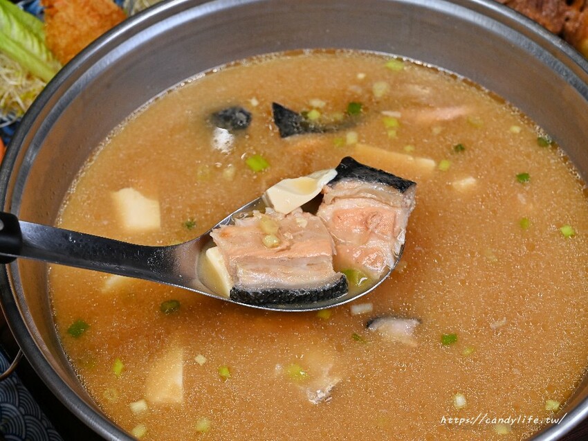 湯品糖糖點了店家推薦的味噌鮮魚湯,採用日本味噌,搭配鮭魚頭、鮭魚尾下去熬煮,湯頭濃厚好喝,裡頭還可以吃到滿滿鮭魚肉塊及軟嫩豆腐