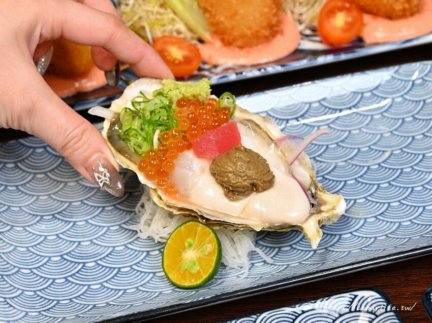 嚴選日本宮城生蠔,一顆約手掌心的大小,上頭佐上鮪魚刺身、鮭魚卵及蟹膏, 冰涼的大生蠔,一入口鮮味立刻在嘴裡爆開來,伴隨著蟹膏的鮮甜,讓人欲罷不能