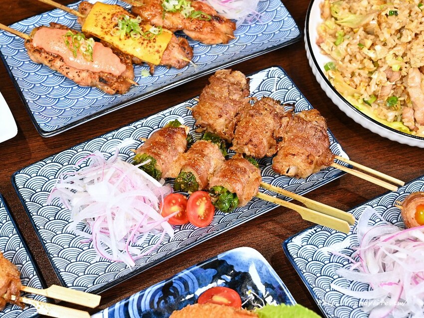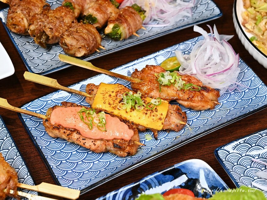 魚煙居酒屋的燒鳥串燒系列也是人氣招牌,燒鳥系列均採用溫體去骨雞腿肉,魚煙招牌燒鳥刷上主廚使用香料、柴魚、蔬菜及水果熬製而成的特製醬料,讓肉質軟嫩的雞腿肉除了炭烤的香氣,還多了醬汁的鹹甜滋味,起司燒鳥及明太子燒鳥用料也相當實在,厚厚一層的明太子醬,層次更豐富