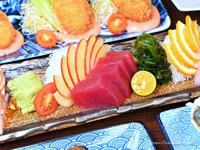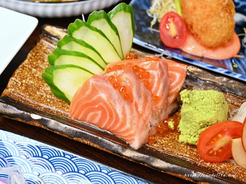 來吃日本料理當然不能錯過刺身囉,糖糖這次點的是綜合刺身大盛,共有十二片,魚貨依當天為主,糖糖這次吃到的綜合刺身有鮭魚、黃鰭鮪魚及紅甘