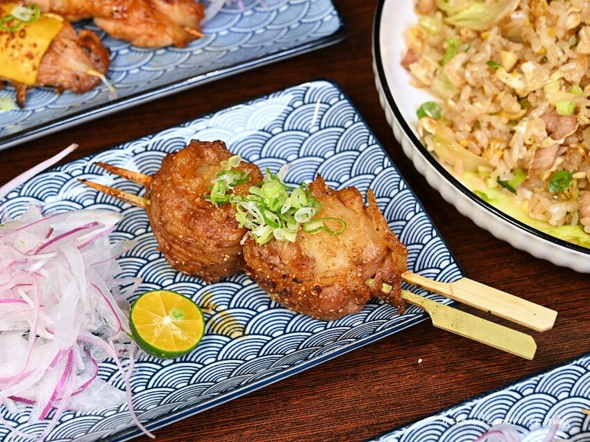 採用油花豐富的牛五花,捲入翠綠蘆筍,讓軟嫩多汁的牛五花多了蘆筍的爽脆及鮮甜滋味,另一串番茄豬肉串是選用豬五花,包入整顆小番茄,咬下去會大爆汁,酸甜滋味中和了豬五花的油膩感,層次更加豐富
