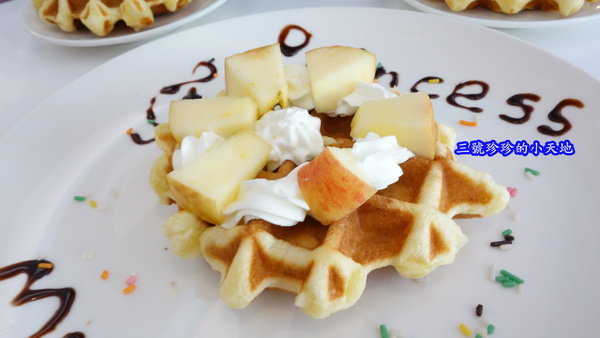 從上面往下拍一張,餐盤上面還用巧克力醬寫了鬆餅公主的英文字