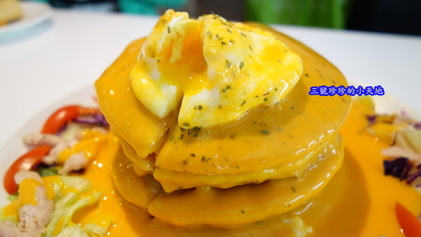 鬆餅上面還放了一顆半生熟的水波蛋,切開來看到蛋黃緩緩地流下............